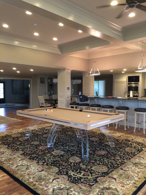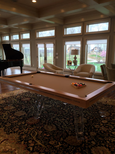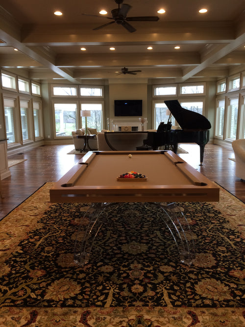 We engineered a hybrid design to bridge this stylistic gap. For the top rails, we selected Blonde Solid Walnut, meticulously grain-matching the timber to complement the residence’s existing hardwood flooring. To accommodate the client's request for an expanded 254cm x 127cm playing surface, we machined a custom six-leg chassis from high-clarity Lucite. This structural configuration was critical; the additional legs provide rigid support for the oversized slate bed while maintaining the visual transparency required to keep the room feeling open.