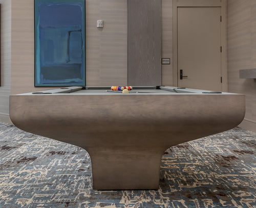 The focus on monochromatic texture was paramount. We meticulously matched the worsted wool playing surface to the deepest grain tones of the Ash wood. This tonal alignment transforms the table from a piece of sports equipment into a unified sculptural element, anchoring the sophisticated ambiance of the lounge.